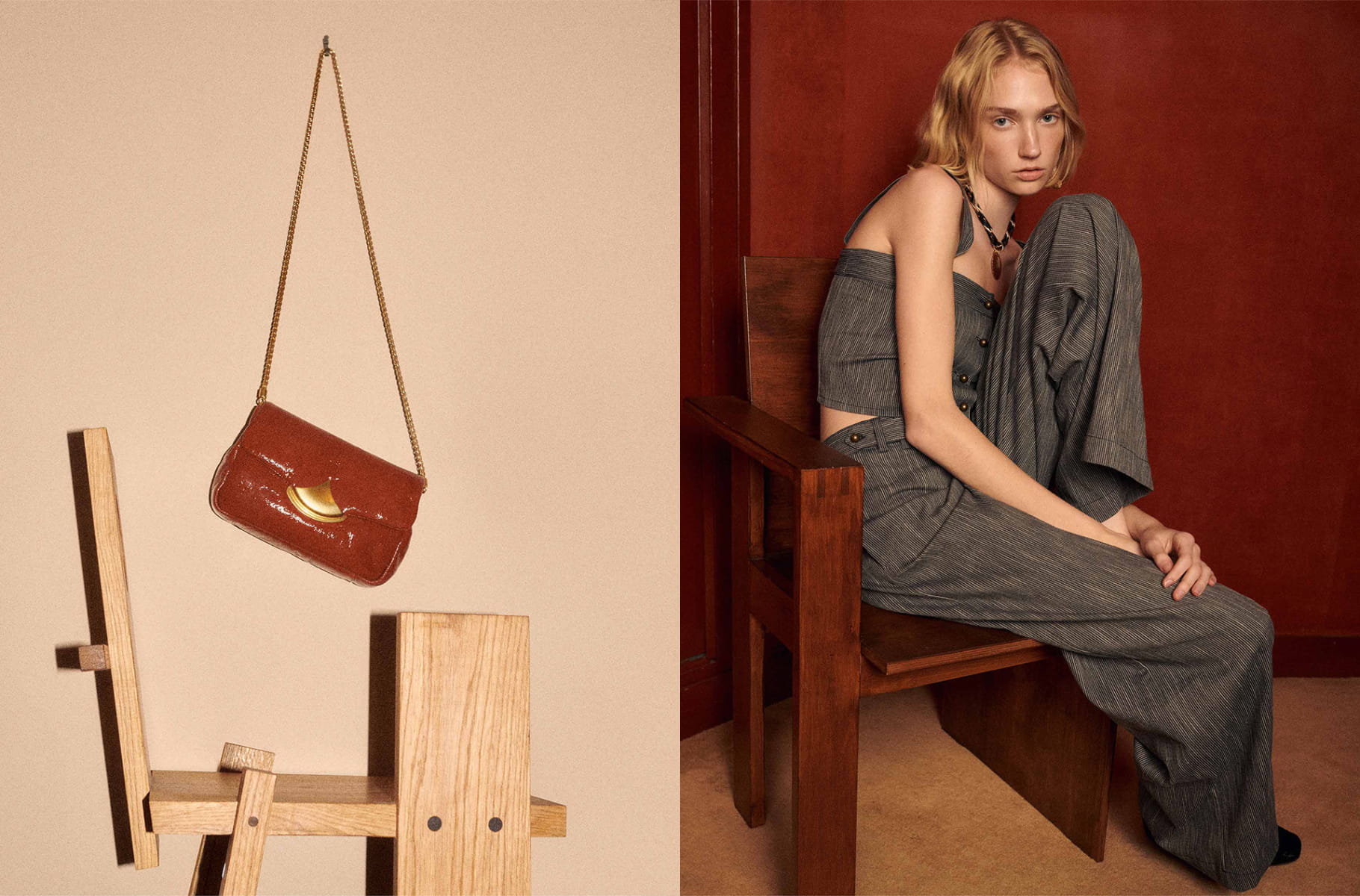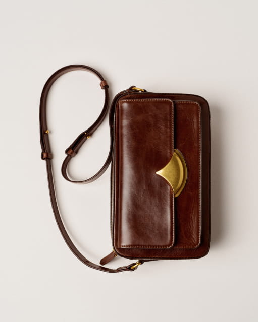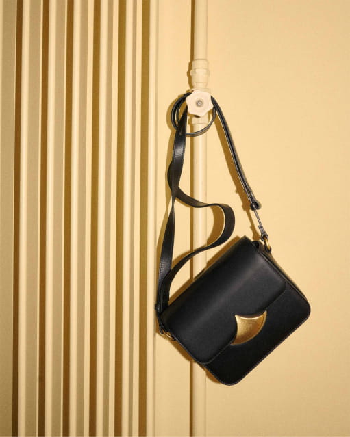 Son fermoir magnétique en métal, inspiré des lignes caractéristiques des modèles Divine et Diviluz, habille une poche à soufflet située à l’avant du sac.