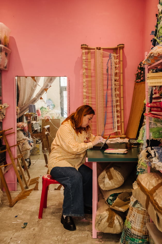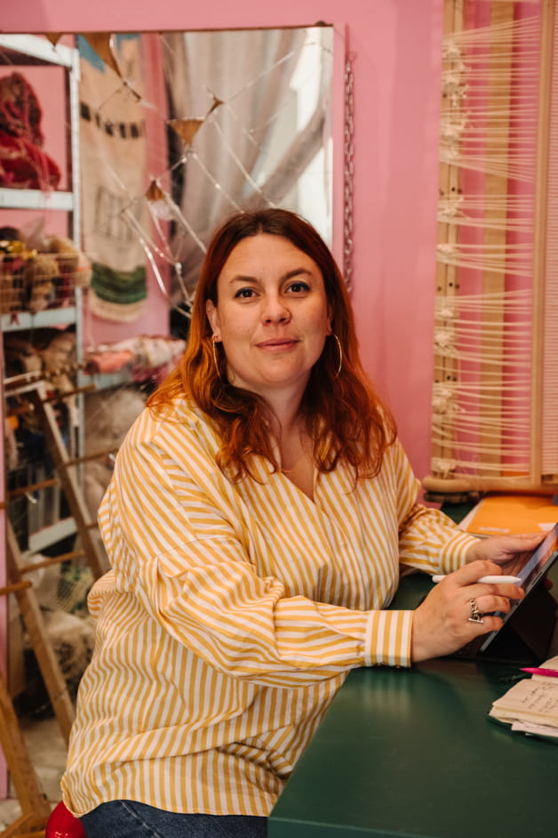 J'ai un atelier à Marseille, au sein de l'atelier partagé Vé aux réformés, il me sert de lieu de rendez-vous et de stockage, il est peint en rose. Dans le Vaucluse j'ai un atelier dans le jardin de la Magnanarié, dans une cabane, il est chaleureux, mes chats aiment venir m'y voir tisser. J'ai beaucoup de caisses remplies de tissus dans chacun de ces ateliers.