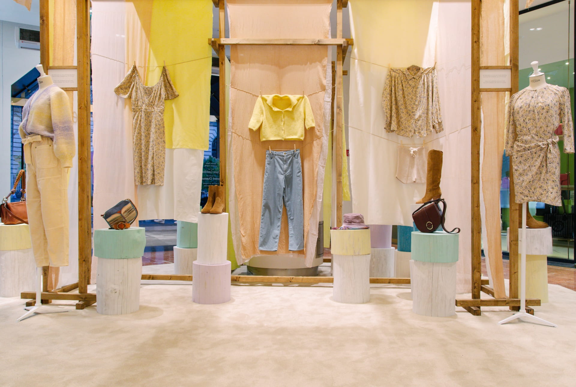 Conçue autour des inspirations de la collection Printemps 2023, la structure aérienne propose une plongée dans une atmosphère chaleureuse aux couleurs de la saison, une palette de pastels et de terres associés à des écrus et des roses, rehaussées de coloris plus frais comme le violet, le fuchsia, le bleu mineral ou le jaune zeste.